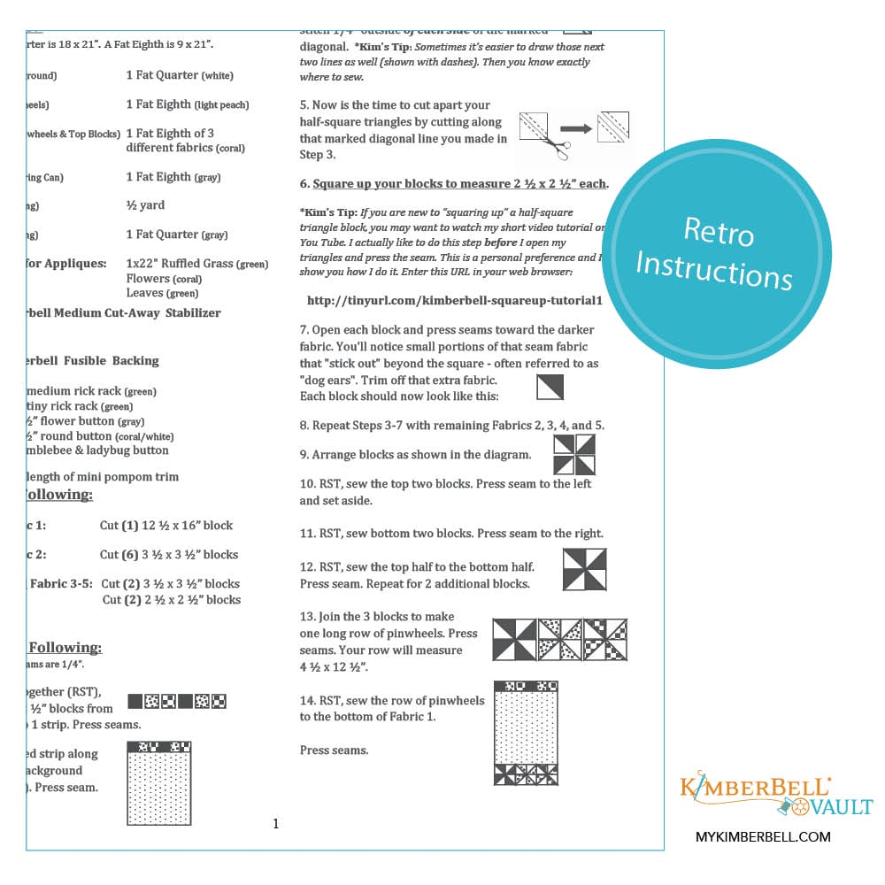 Celebrate spring with a watering can, fabulous flowers, and sweet pinwheel blocks! Kimberbell’s 12 1/2 x 22 1/2” Spring Door Decor is breezy and beautiful, with a busy bee, pretty patchwork, and a ruffled strip of grass.