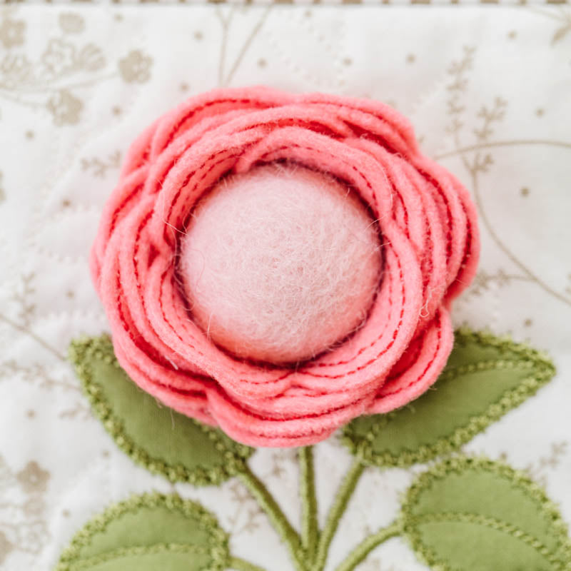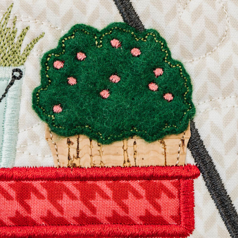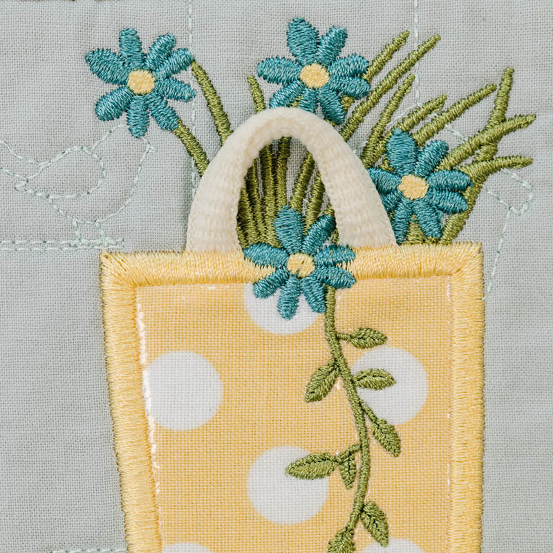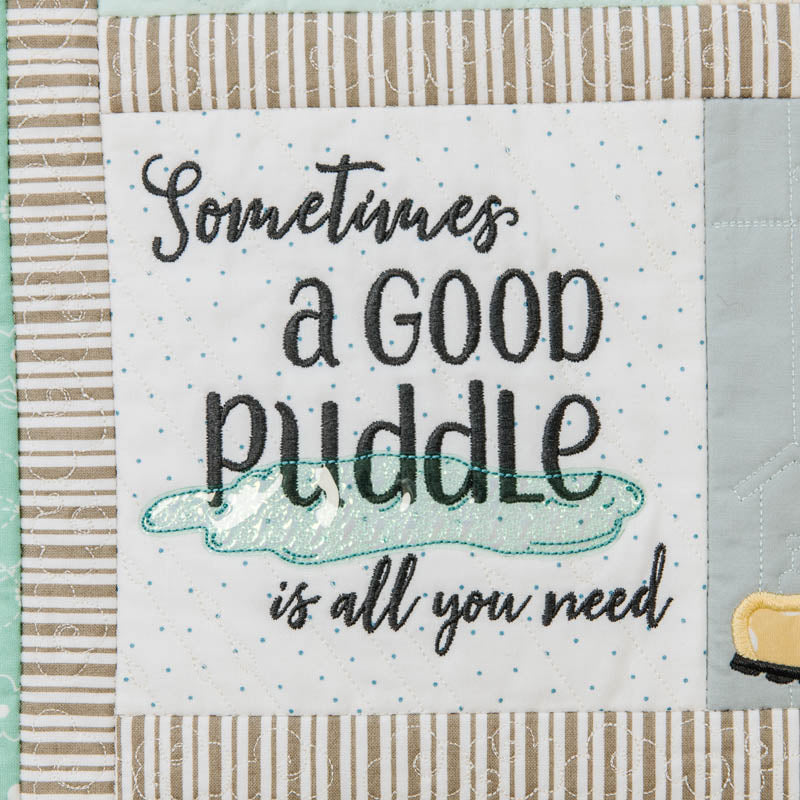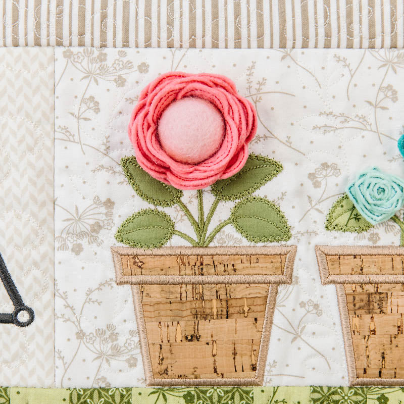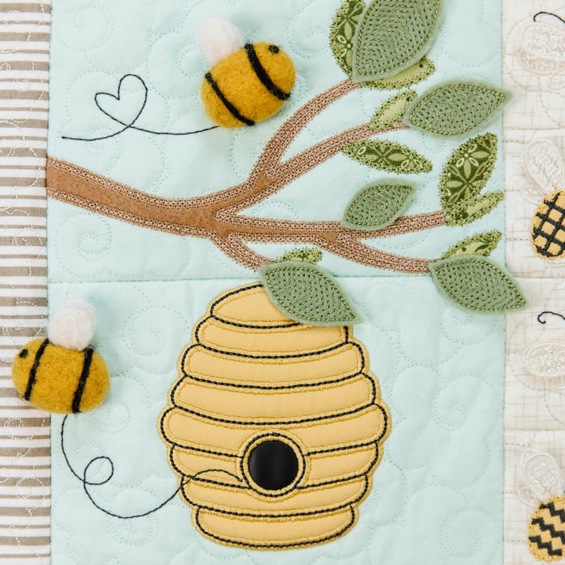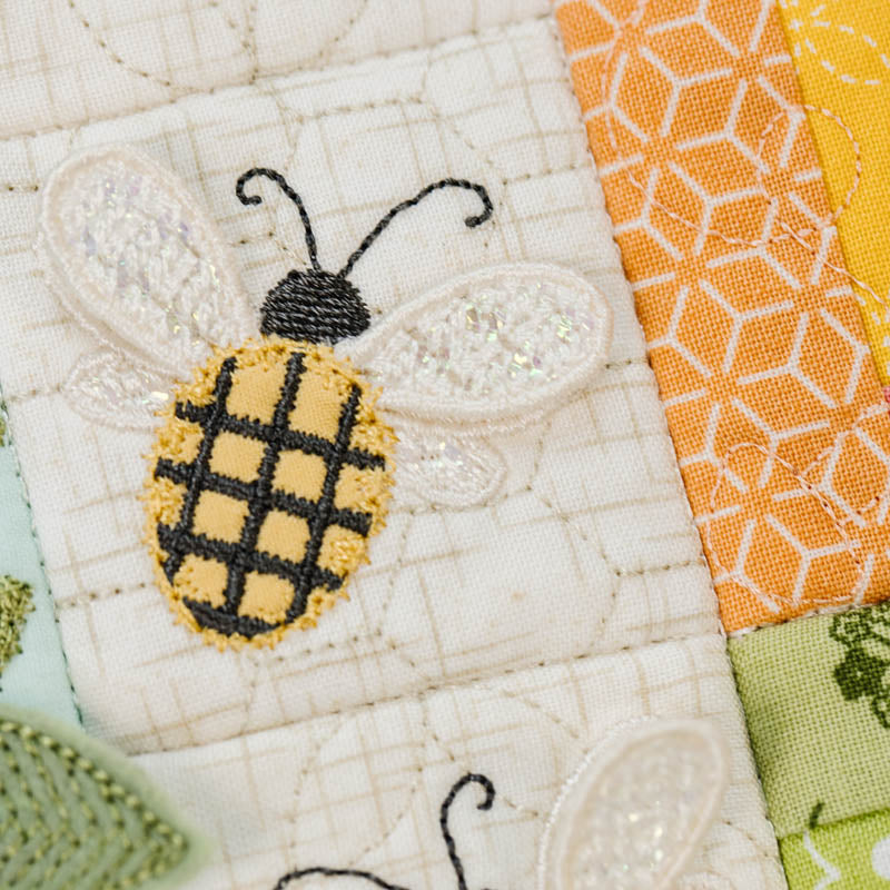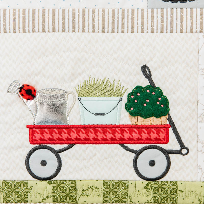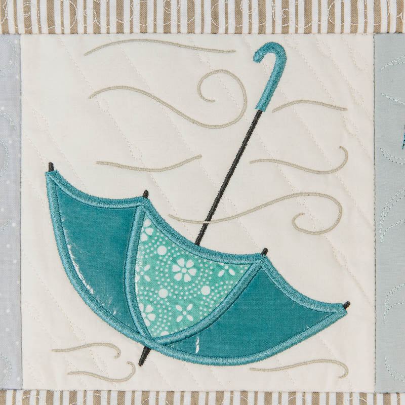 Spring Showers celebrates spring in all of its glory! Bumblebees buzz happily around the dimensional beehive, while applique umbrellas are pops of color in the blustery weather. Load the little red wagon for the garden, fill pots with felt flowers, and piece log cabin blocks in-the-hoop! With rainboots, sweet sentiments, and THREE bonus projects, this quilt is a breath of fresh air.