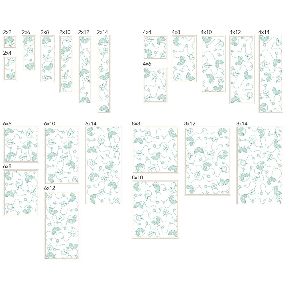 Again, your purchase of St Patricks 5 includes 44 file sizes: 22 files for the Clear Blue Tiles ® quilting method and 22 files for the Block-by-Block quilting method. Files will fit within any size of machine embroidery hoop, from 4×4 up to 9×14!