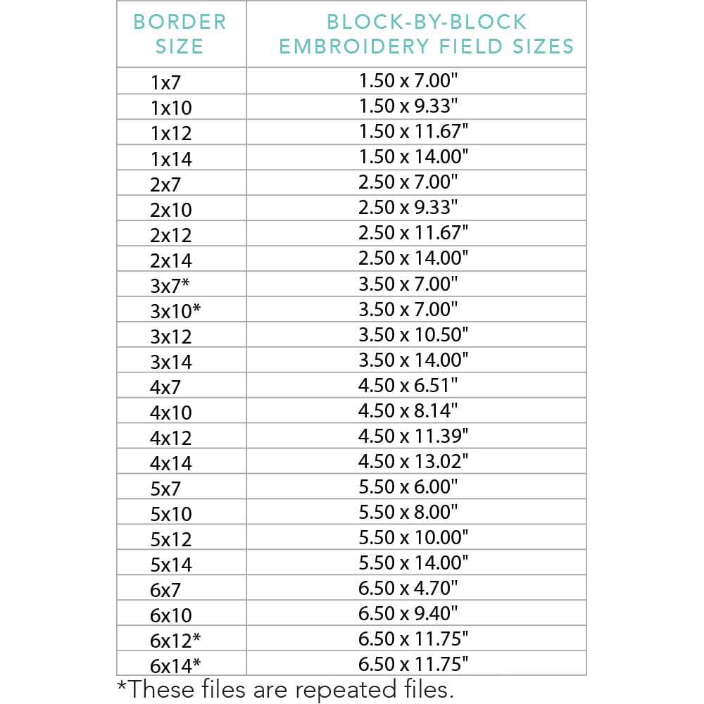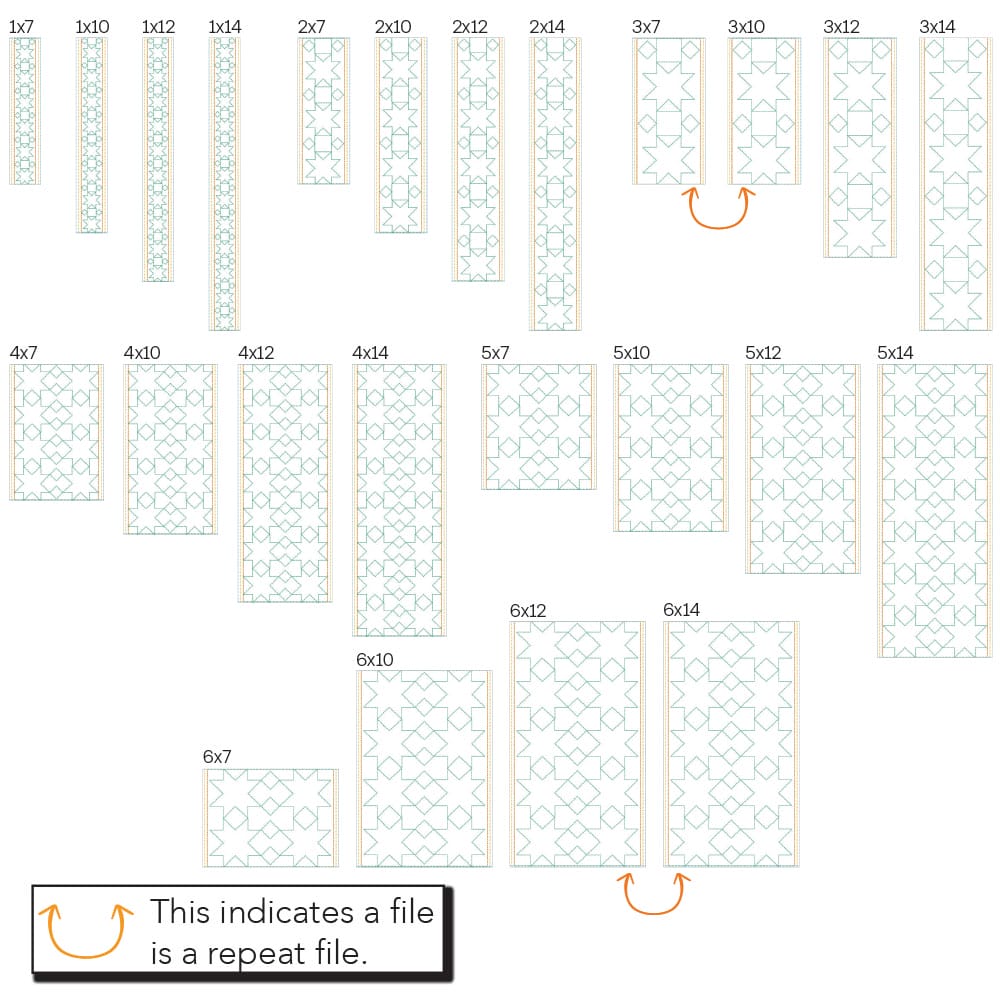 Again, your purchase of Star Border 2 includes 24 file sizes for the Block-by-Block quilting method, including 4 repeat files. Files will fit within any size of machine embroidery hoop from 5×7 up to 9×14!