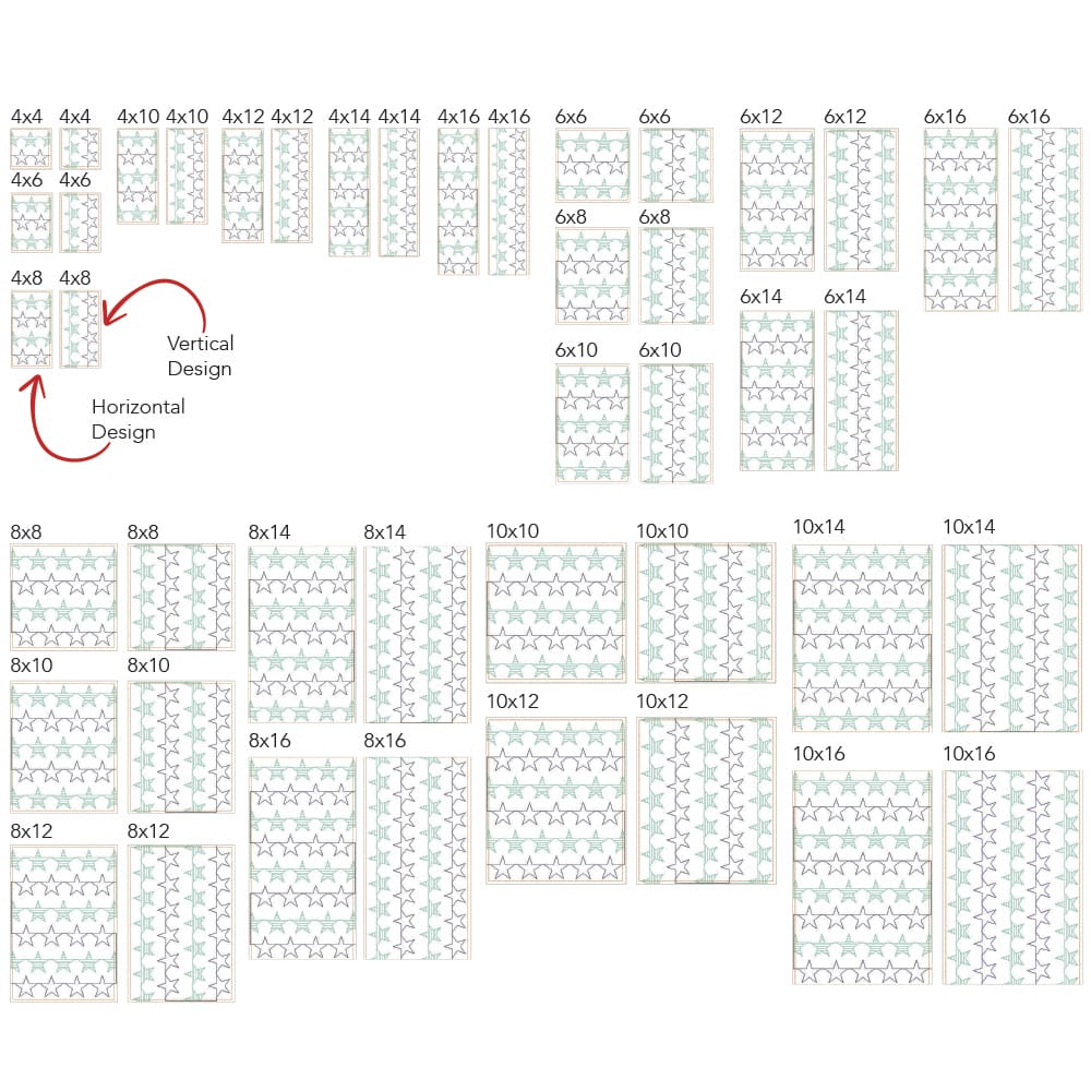 Again, your purchase of the large-scale Stars 14 design includes 44 file sizes: 44 files for the Block-by-Block quilting method. These large-scale design files fit within machine embroidery hoop sizes 4×4 to 10×16!