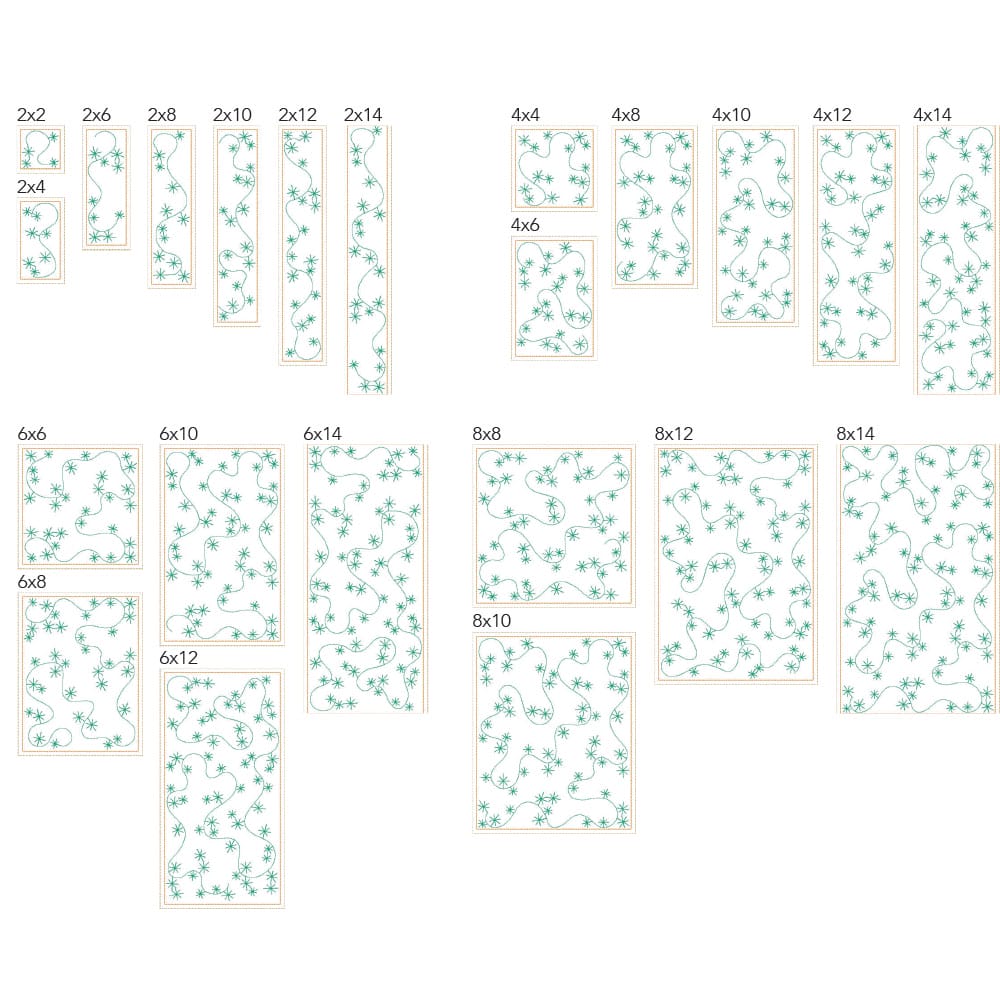 Again, your purchase of Stars 3 includes 44 file sizes: 22 files for the Clear Blue Tiles quilting method and 22 files for the Block-by-Block quilting method. Files will fit within any size of machine embroidery hoop, from 4×4 up to 9×14!