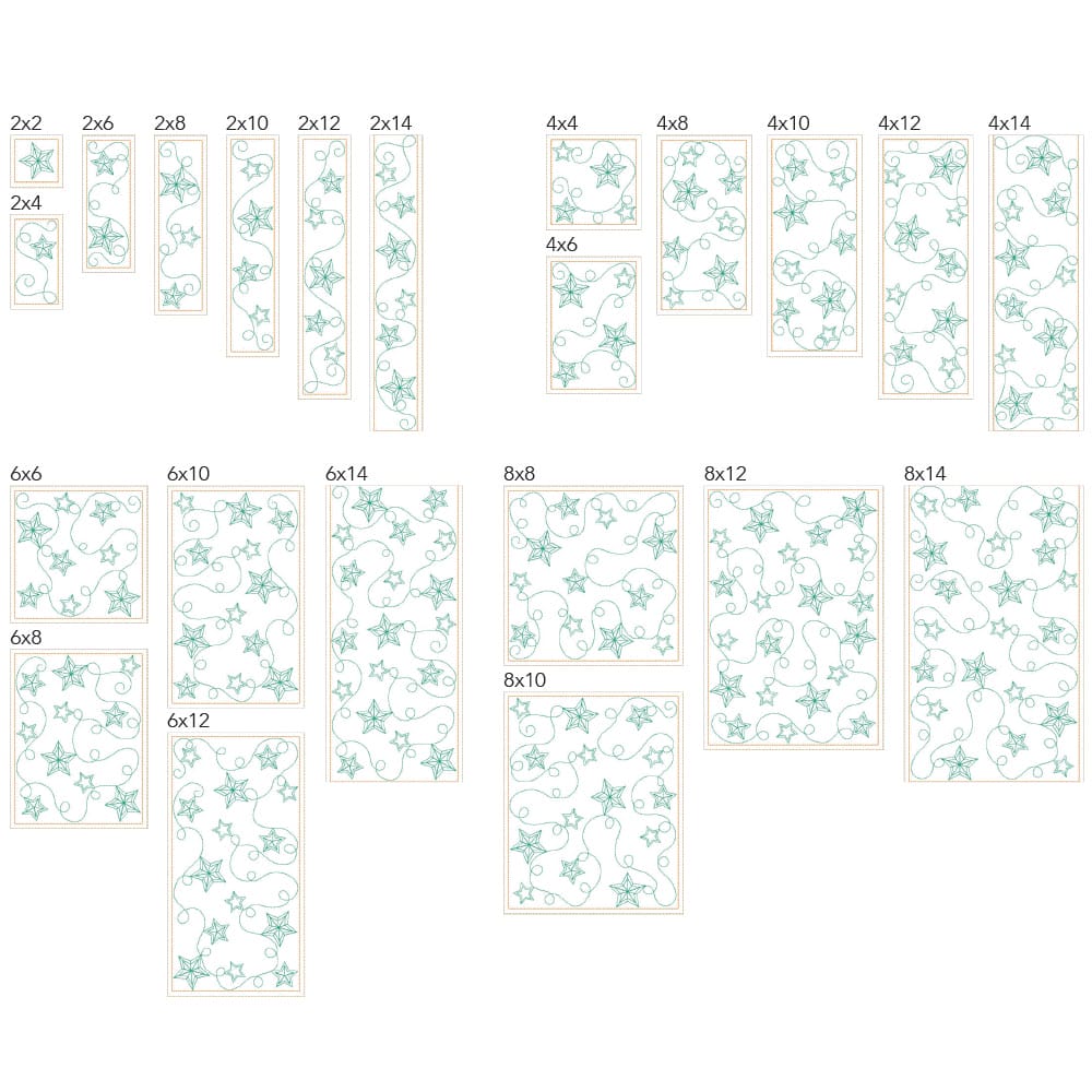 Again, your purchase of Stars 8 includes 44 file sizes: 22 files for the Clear Blue Tiles ® quilting method and 22 files for the Block-by-Block quilting method. Files will fit within any size of machine embroidery hoop, from 4×4 up to 9×14!