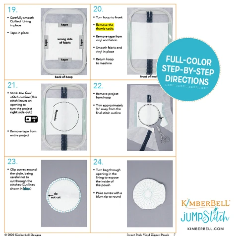 Kimberbell’s Sweet Peek Zipper Pouch features decorative stitching beneath a window of Sweet as Candy Clear Vinyl. Made completely in a 4×4, 5×7, or 8×8 hoop, this giftable pouch is topped by a lovely Lace Zipper with a vintage brass pull.