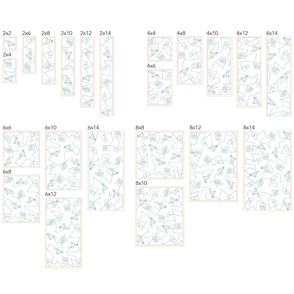 Again, your purchase of Valentine 1 includes 44 file sizes: 22 files for the Clear Blue Tiles ® quilting method and 22 files for the Block-by-Block quilting method. Files will fit within any size of machine embroidery hoop, from 4×4 up to 9×14!