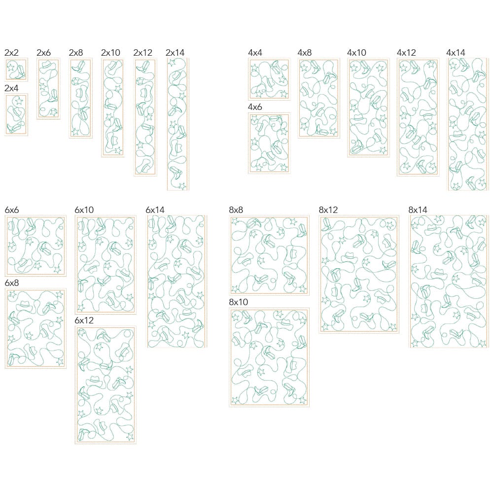 Again, your purchase of Western 1 includes 44 file sizes: 22 files for the Clear Blue Tiles ® quilting method and 22 files for the Block-by-Block quilting method. Files will fit within any size of machine embroidery hoop, from 4×4 up to 9×14!